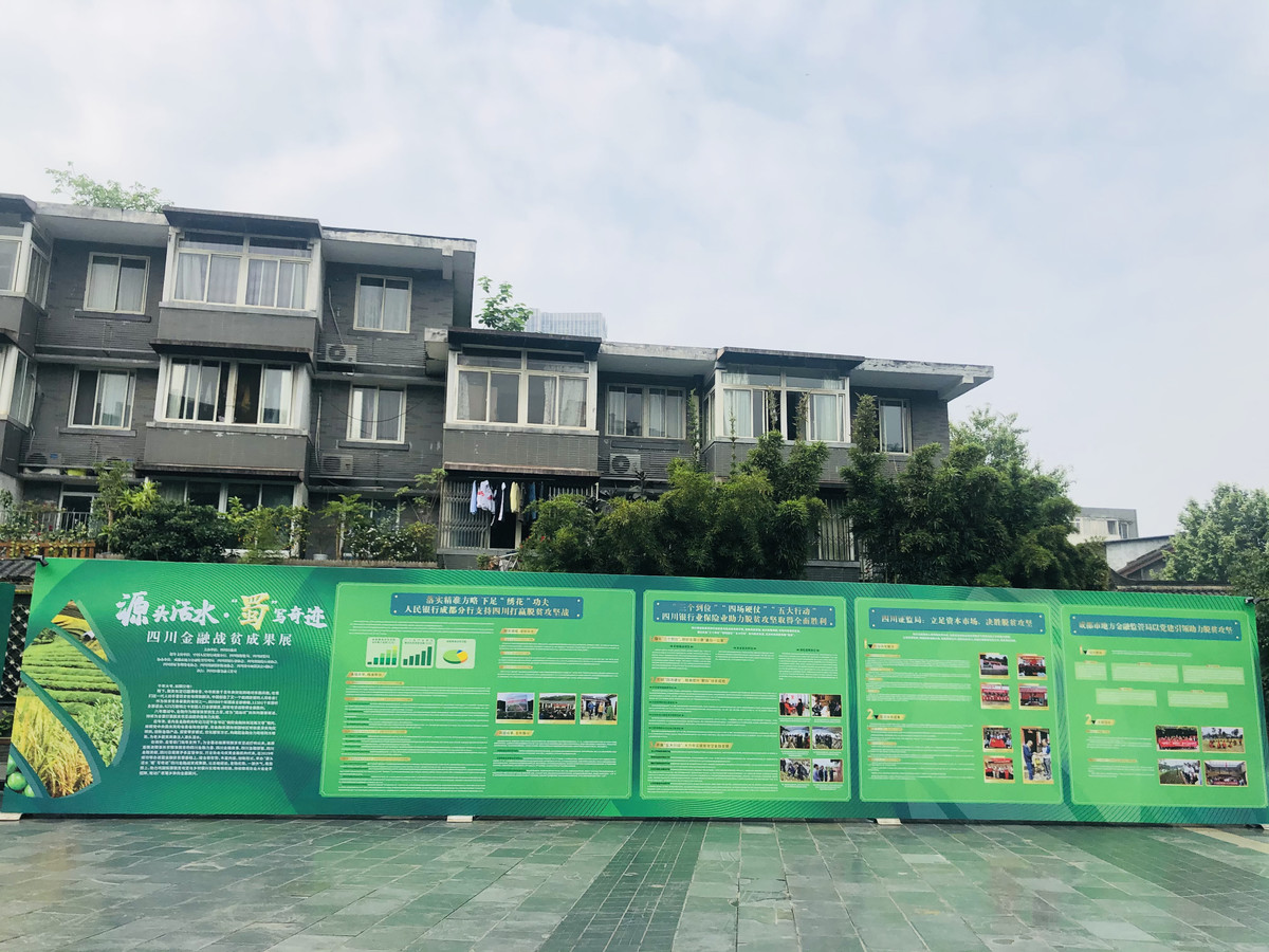 成绩也来源于金融机构的行动,坝坝会、入户走访、深入田间地头调查研究、与村两委干部共同制定发展规划,成都市地方金融监督管理局的展板详细记录着金融助力简阳市施家镇悦乐村脱贫全过程。