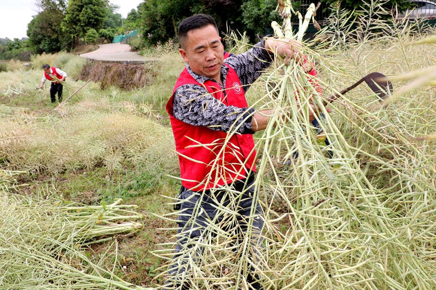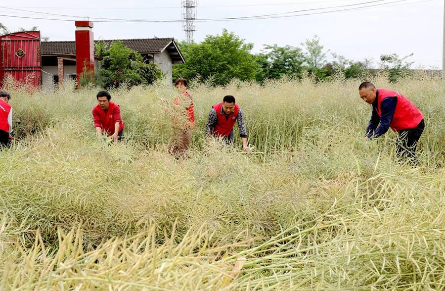 4月25日,在仁寿县黑龙滩镇渡槽村,党员干部正在帮助缺劳收割油菜。眼下,正是农村“双抢”时节。连日来,仁寿县结合党史学习教育,在党员干部中广泛开展“我为群众办实事”主题活动,1.2万名党员干部走进田间地头,帮助缺劳户抢收油菜,确保应收尽收。