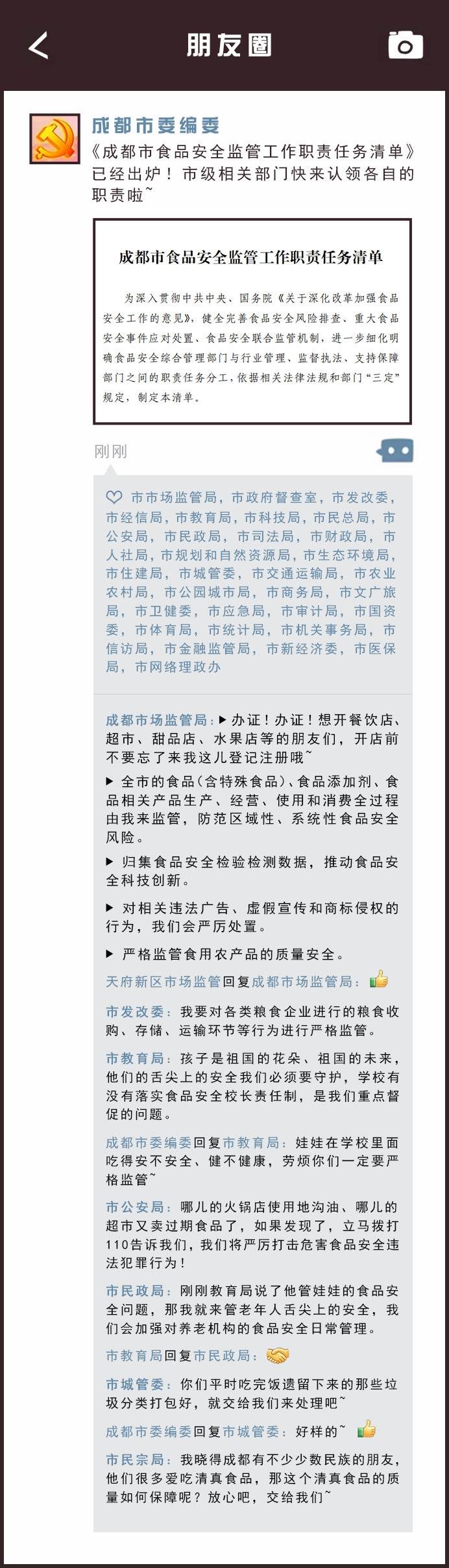 近日,成都在全国副省级城市中第1个以市委编制委员会名义出台《食品安全监管工作职责任务清单》(以下简称《清单》),运用“三定方案”方式明确市委市政府各部门、产业功能区等食品安全工作责任,突破性建立以“党政同责清单”为基本遵循、以“职责任务清单”为重要支撑、“市委编委+食安委”两委双线推动的制度设计。这是4月26日记者从成都市市场监管局获悉的。