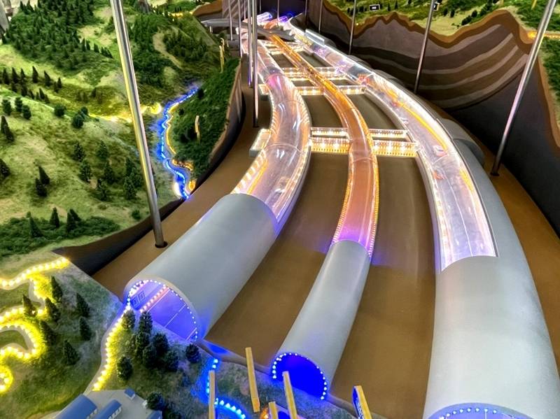 一般高速公路隧道为双洞,而大凉山1号隧道,却在双洞之间设置了一个平导洞。从中铁十八局项目部展示的沙盘可以看到,TBM在平导洞间掘进后,施工人员从平导洞进入左、右的主洞,开设作业面,进行掘进。