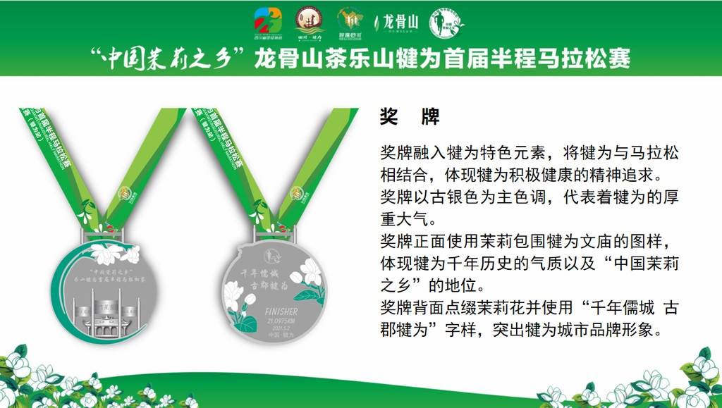 犍为正在打造成渝双城经济圈巴蜀文化旅游走廊重要节点,此次犍为半马比赛奖牌也融入犍为特色元素,奖牌以古银色为主色调,代表着犍为的厚重大气,奖牌正面使用茉莉包围犍为文庙的图样,体现犍为千年历史的气质以及“中国茉莉之乡”的地位。奖牌背面点缀茉莉花并使用“千年儒城 古郡犍为”字样,突出犍为城市品牌形象。