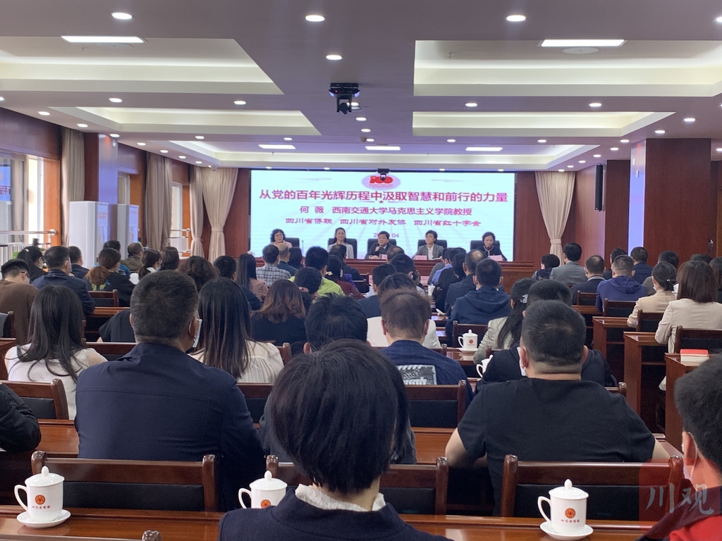 4月26日,在成都华侨大厦内,来自省侨联、省对外友协、省红十字会的近百名机关干部职工聆听了党史学习教育省委宣讲团成员、西南交通大学马克思主义学院教授何薇带来的宣讲。与此同时,来自市州侨联、对外友协、红十字会共计300余名干部职工通过网络视频在各市州分会场同步收看了宣讲活动。