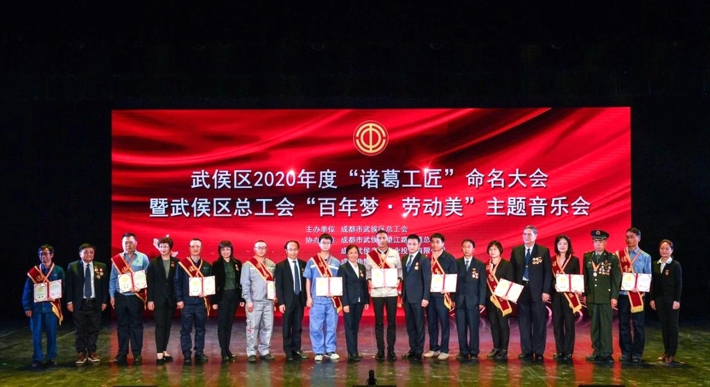 为大力弘扬劳模精神、劳动精神、工匠精神,激励全区广大职工立足岗位砥砺奋进、忠于本职建功立业,4月25日晚,成都市武侯区总工会在成都市音乐坊潮音多功能剧场主办了武侯区2020年度“诸葛工匠”命名大会暨“百年梦·劳动美”主题音乐会,来自武侯区各行业共90名职工获得武侯区2020年度“诸葛工匠”命名。