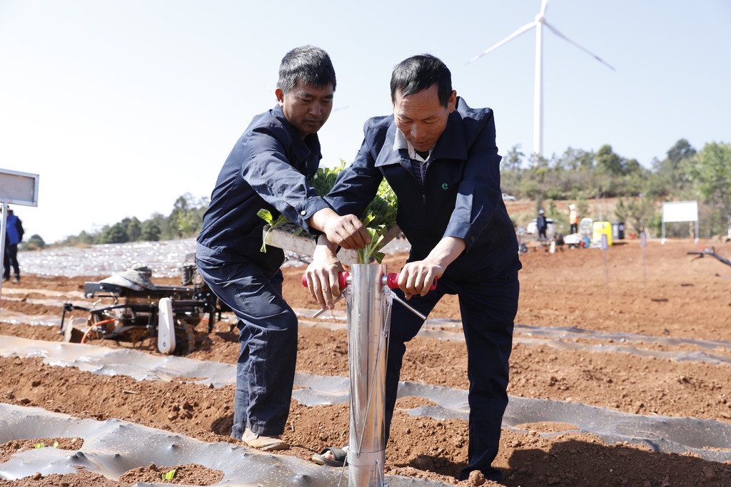 当天,攀枝花市仁和区大龙潭乡烟叶技术员李中学为烟农介绍移栽施肥一体器。“捏住机器上端的开关,把机器插入土里,再将烟苗放在机器舱口,这样操作就可以了。”说话间,李中学把手里的机器拔出土壤,翠绿的烟苗已经挺立在土垄上。“这些农机具工作效率平均是2秒/株,日工作效率达8-12亩/人,比传统人工效率提高了3—4倍。”李中学说。