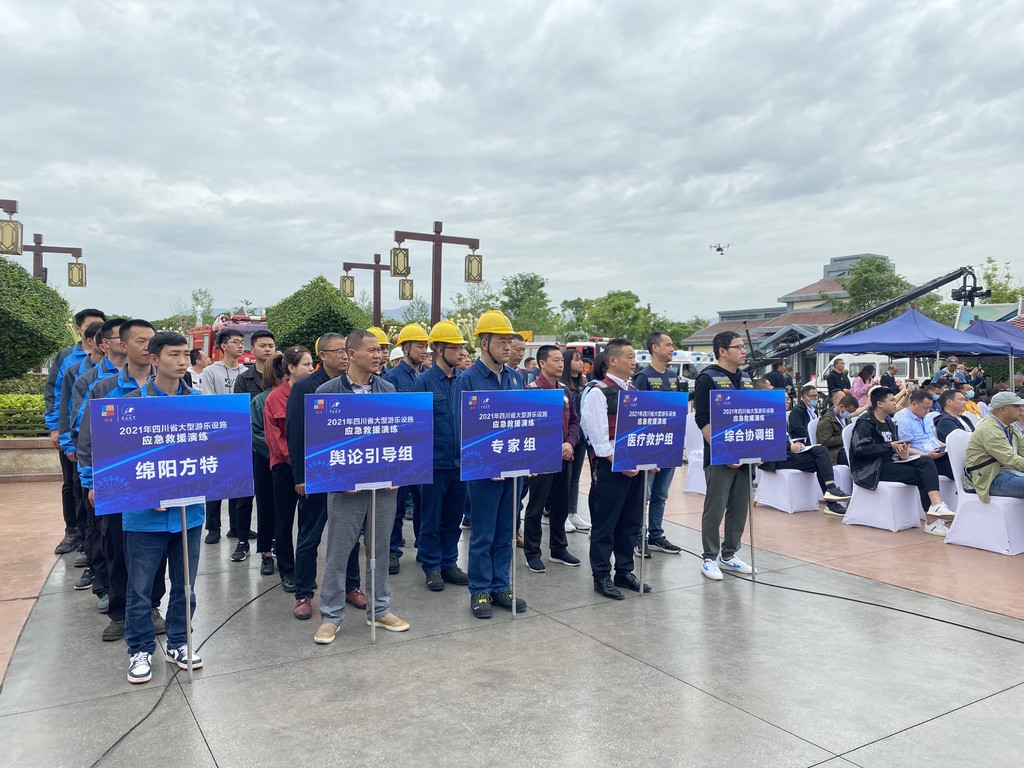 演练模拟背景是绵阳市江油市方特东方神画游乐场一台飞行塔类大型游乐设施,设备运行高度40米,因停电发生乘客滞留,企业通过泄压下降高度的方式进行应急处置,但在处置过程中又因设备发生机械卡阻,无法采取泄压方式继续下降高度,企业无法实施救援须请求消防、公安、卫健等部门参与,应急处置响应等级提高,消防、公安、卫健等各部门迅速联动采取措施,实施联合救援。同时,宣传部门针对网络出现的舆情信息进行处置、引导,最后在多方的协同配合下顺利完成救援。