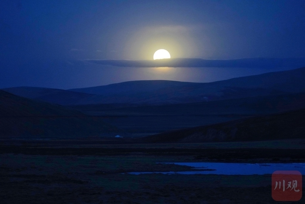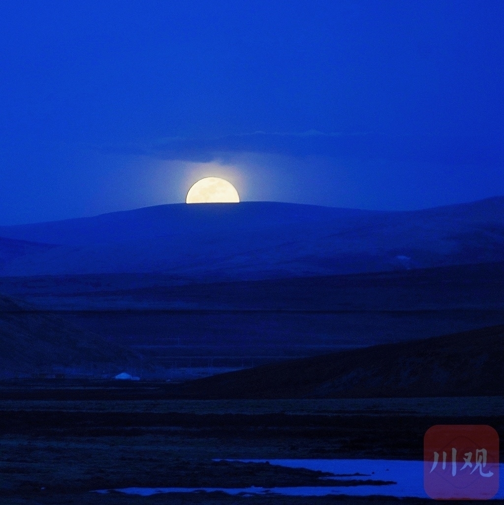 4月27日晚8点25分,在甘孜州石渠县色须镇日杂村省道214路上,此时户外气温零下3.5度,海拔高度为4320米,东望天际线山峦起伏的雪线上,天空泛黄,穿过雪域高原的超级月亮如期而至,从山巅半月到穿过云带的皓月当空,也就10分钟。