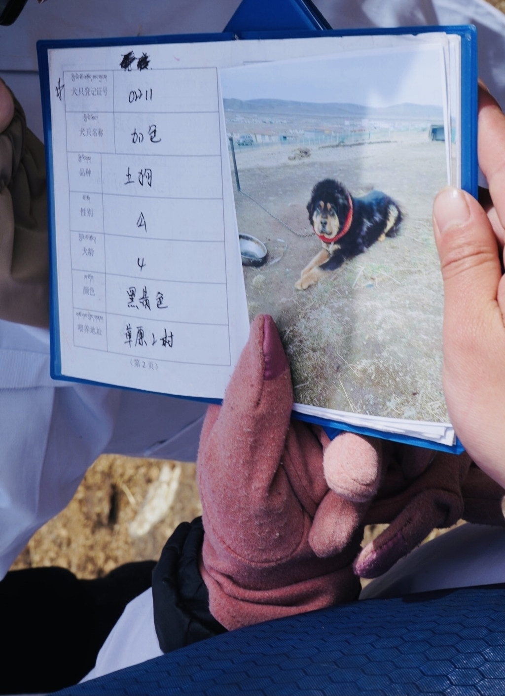 1992年出生的土登拉姆是德荣玛乡草原一村的犬只驱虫员。从2017年至今,她已干了4年。提到刚参加工作那会,那双明亮的眼睛偶尔也会往上望,不想让什么湿润的东西流下来。“我被吓哭过。”土登拉姆说,2017年底,去到一户牧民家里,正在给一个到她大腿高的大狗看“项圈”、做信息录入,这条大狗突然挣脱锁链,朝她扑过去,作攻击状,幸好牧民当时阻止及时。