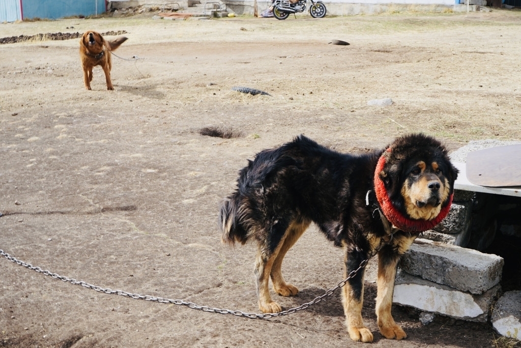 一只名叫加色的狗(黑色)和一只名叫加加的狗(黄色)被拴上了链子。在石渠县,牧区每户限养家犬2只。魏冯摄