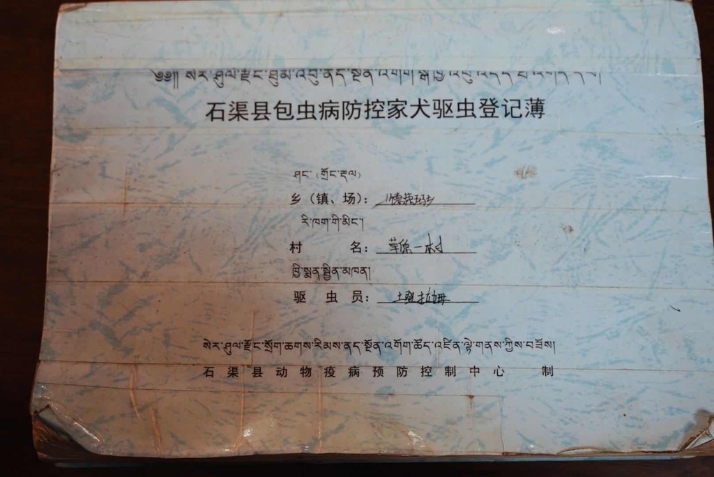 在石渠县的德荣玛乡,4个村,就分配4名犬只管理员。其中有3名90后“女汉子”常年和狗打交道。她们每个月的10号要给犬做包含有内驱虫药物的糌粑,并在每一份《养犬证》上信息登记,给村民普及包虫病防治知识。