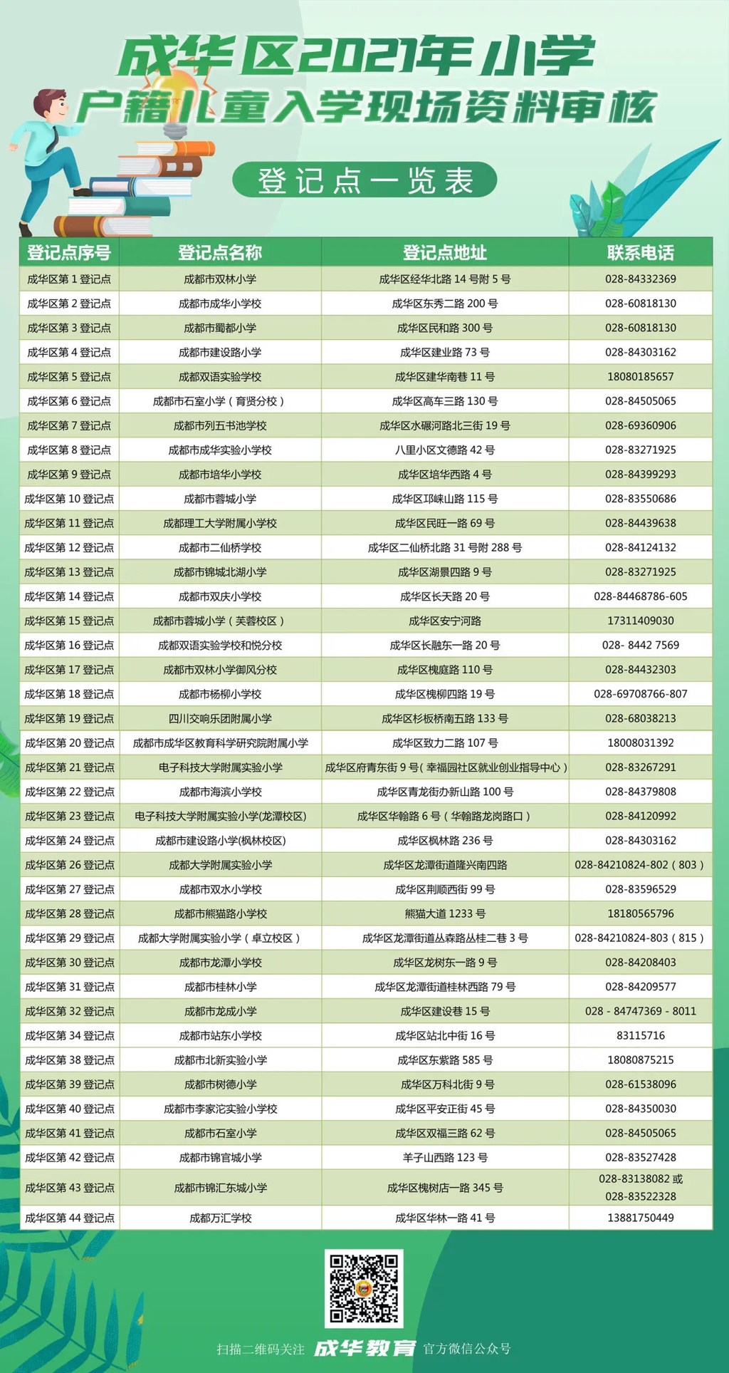 4月28日,记者从成华区教育局获悉,2021年成华区户籍适龄儿童入学报名即将开始!按照成都市教育局的统一安排,成华区各登记点于今天发布户籍适龄儿童公办小学入学报名登记公告,入学指南请看下方: