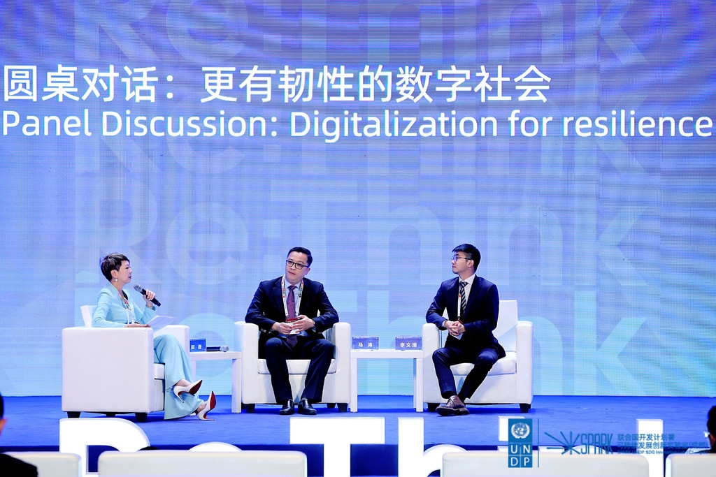 当日,首届Re:Think联合国开发计划署可持续发展创新会议同步举行。150余名国内外专家学者、企业家等嘉宾,以“驾驭数字化解决方案,让经济社会更有韧性”为主题,展开了线上线下的对话交流。