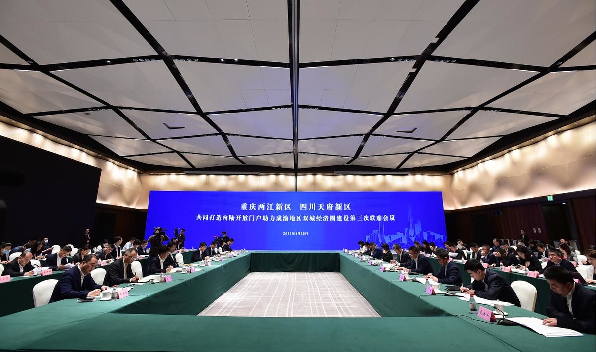 4月29日,重庆两江新区、四川天府新区举行共同打造内陆开放门户助力成渝地区双城经济圈建设第三次联席会议暨两江新区、天府新区产业旗舰联盟启动仪式。