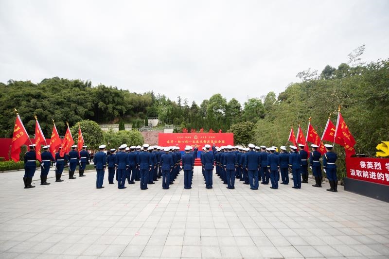 28日下午14时30分,全体指战员来到蒲江县西来镇铜鼓村,向成都战役纪念碑敬献花篮。在纪念碑前,全体指战员肃穆伫立,齐声高唱中华人民共和国国歌。伴随着庄严的《献花曲》,2名礼兵抬起花篮,踏着礼步缓缓走向纪念碑。李健政委、喻平文支队长迈步向前,仔细整理花篮缎带,并带领全体指战员脱帽向成都战役纪念碑鞠躬致敬,缅怀在成都战役中牺牲的革命先烈。