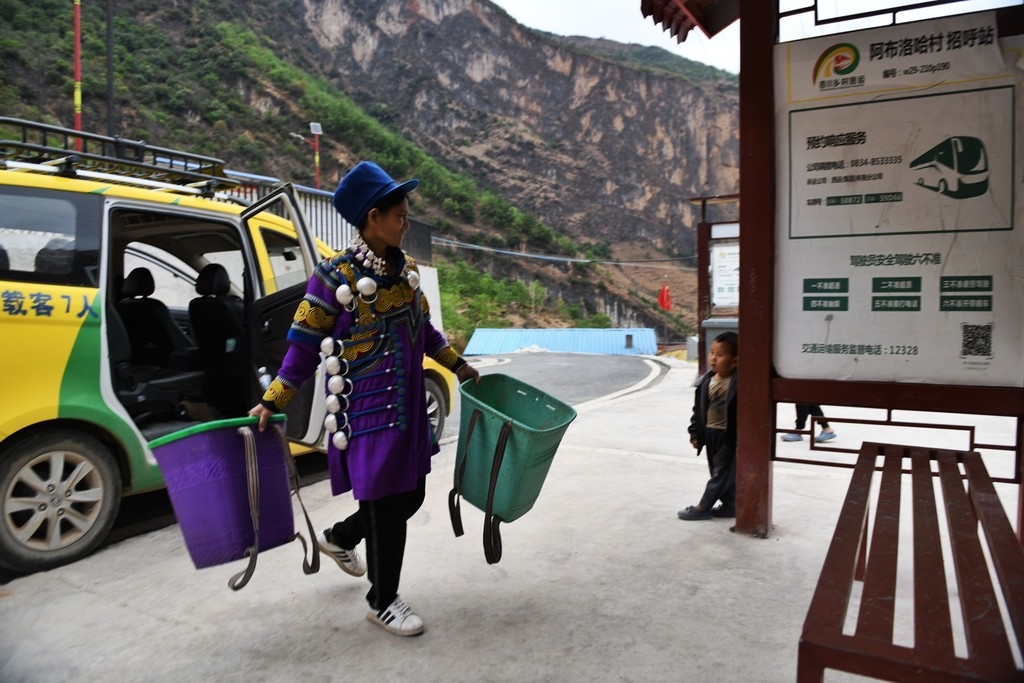 约10时30分,陈三驾驶的车辆安全到达拖觉镇,且沙么次杂背着背篓下了车,她要购买一些食盐等生活用品。且沙么次杂曾经是村里的贫困户,在脱贫攻坚政策的惠及下,她家大力发展种植、养殖,去年全家实现收入9000元以上,成功脱贫退出。在一家熟悉的超时,她还遇到了一位亲戚,和亲戚说起村里通车的情况,她满是自豪。曾经,由于不通车,她几乎很少出村。