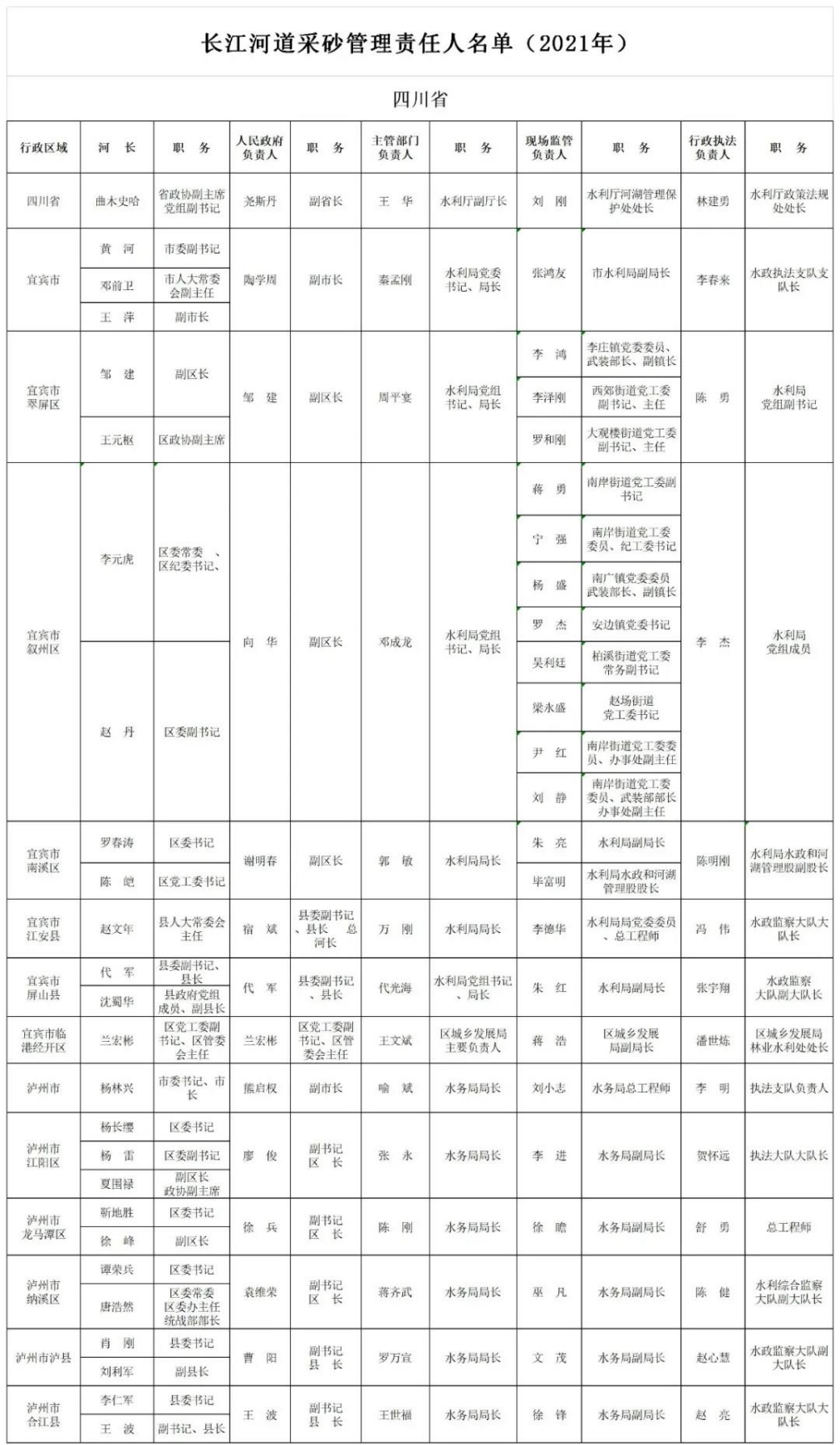 为了促进长江采砂管理工作,有效落实长江采砂管理责任制,长江沿线各地确定了采砂管理各级河长、人民政府、水行政主管部门、现场监管以及行政执法责任人名单。四川是长江上游重要生态屏障,这份名单也涉及四川不少人,我们一起来看看四川省长江河道采砂管理责任人都有谁吧。