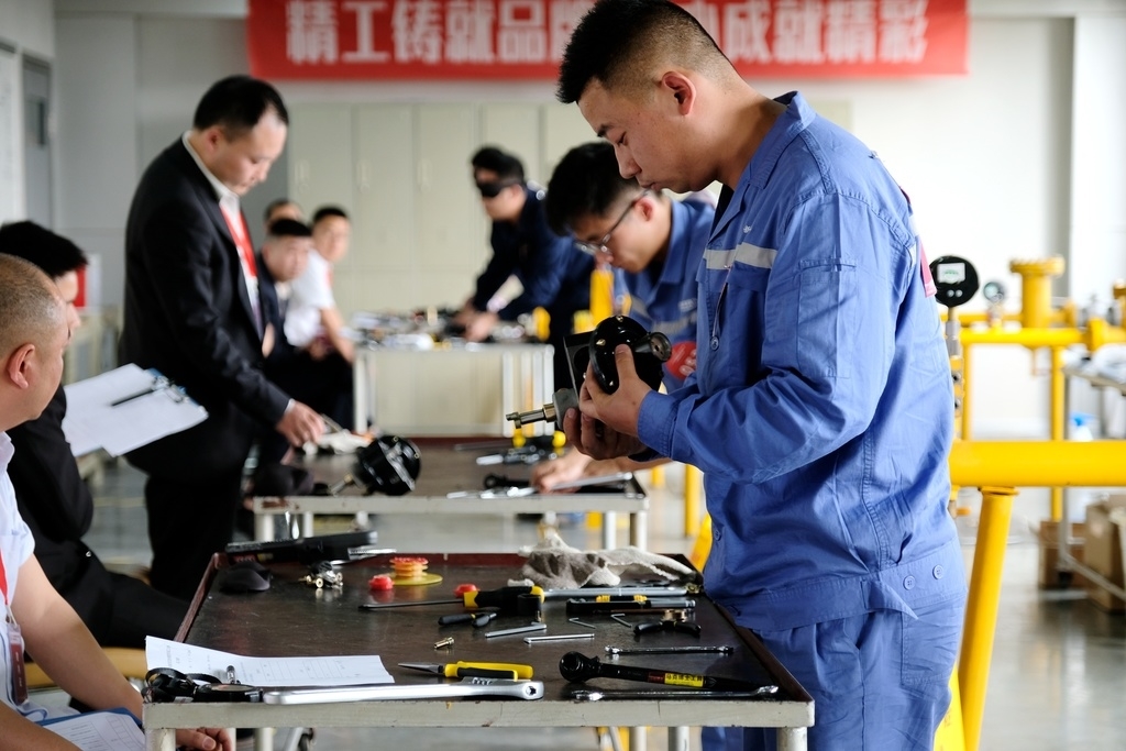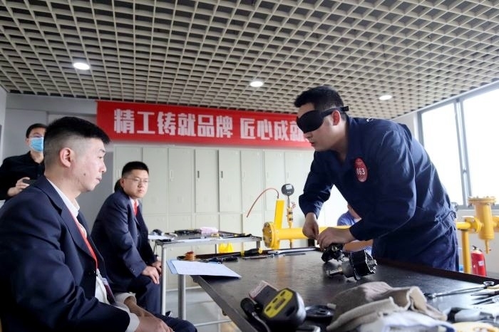 在比赛中,选手们沉着应对,以精益求精的态度,以匠人的精神,努力拼搏。在实际操作技能竞赛中,蒙眼拆装安全切断阀这个环节,尤其考验选手的技能水平。据此次比赛的总裁判吴志毅介绍,工人正常睁眼拆装需要20分钟,而这些优秀选手在蒙眼情况下,盲拆盲装只需要10分钟左右便可以完成。