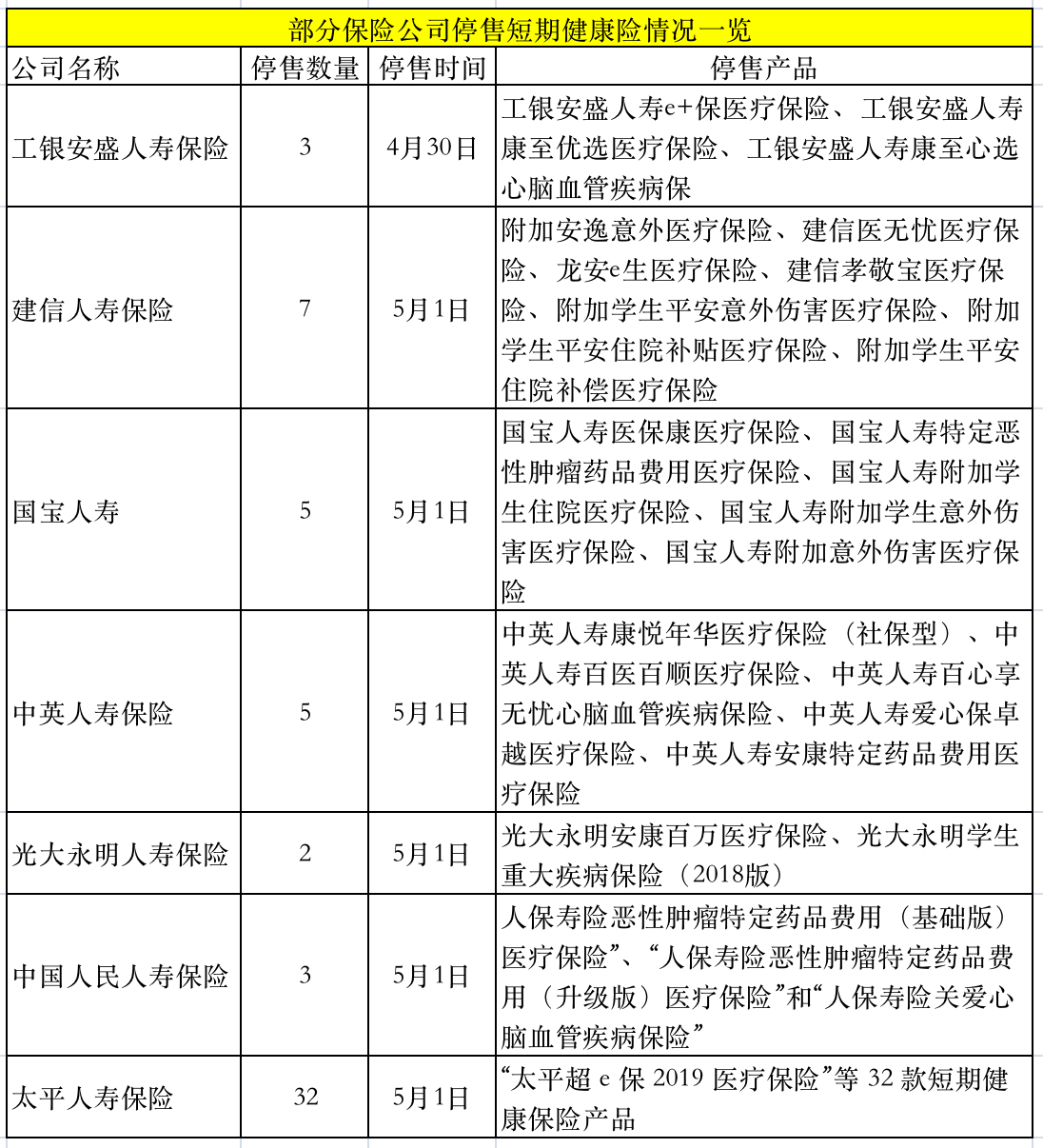 这些不合规的短期健康险产品大多在5月1日开始停售,但也有部分保险公司的产品在5月1日之前就已经下架。比如工银安盛人寿保险的3款产品在4月30日就开始停售。