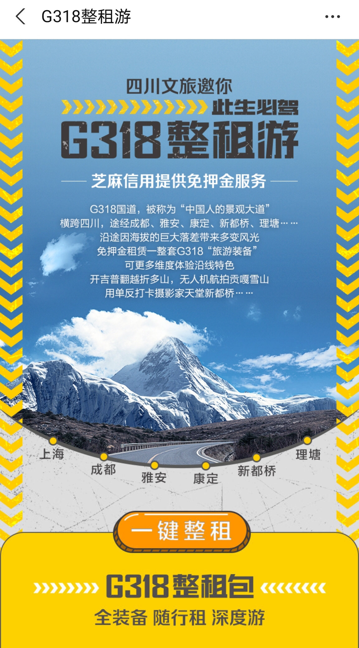 5月1日,记者从支付宝获悉,由四川文旅和芝麻信用合作的国道318整租游主题已经上线,只要芝麻分550及以上就有机会免押金租车、酒店信用住,可以租赁无人机、单反相机、云台、运动相机等装备,为五一期间在四川自驾旅行的游客提供了便利。