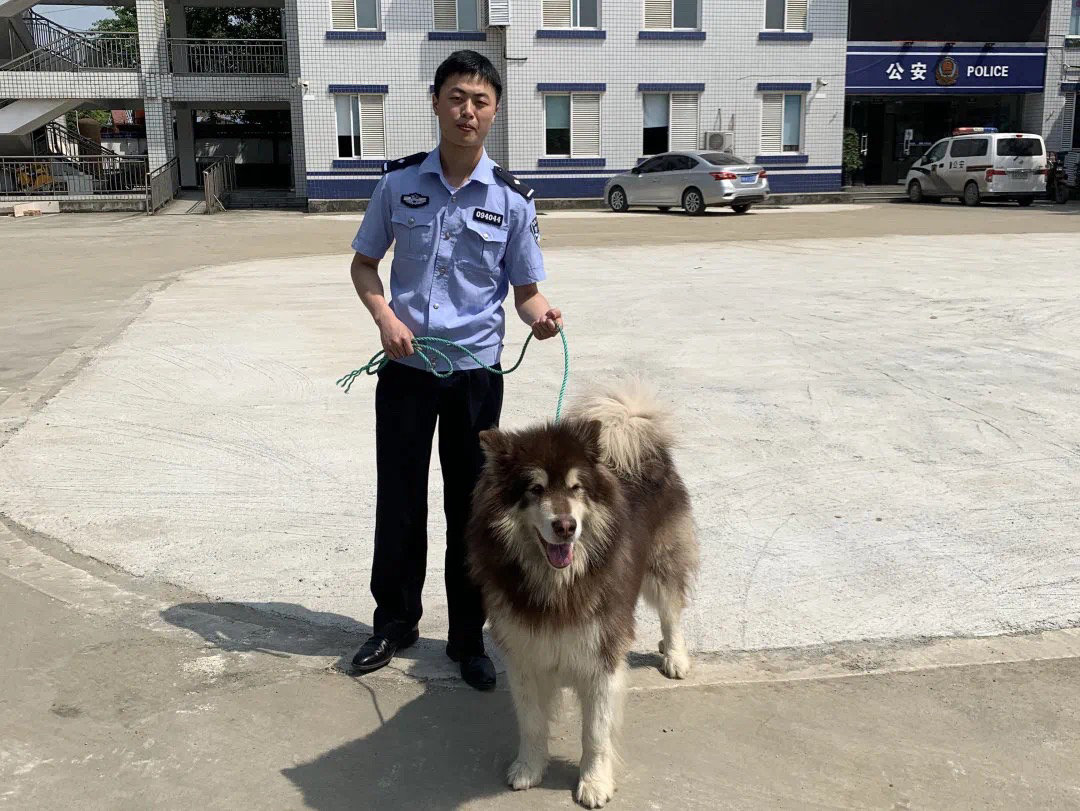 4月30日20时许,彭州公安繁江路派出所民警接到群众报警,一名群众在路过彭白路双牌路口处看见一条阿拉斯加犬,绳索还套在颈部,现场没有发现主人。民警到达现场后多方寻找,没有找到狗狗主人,无奈只能将狗狗带回派出所。