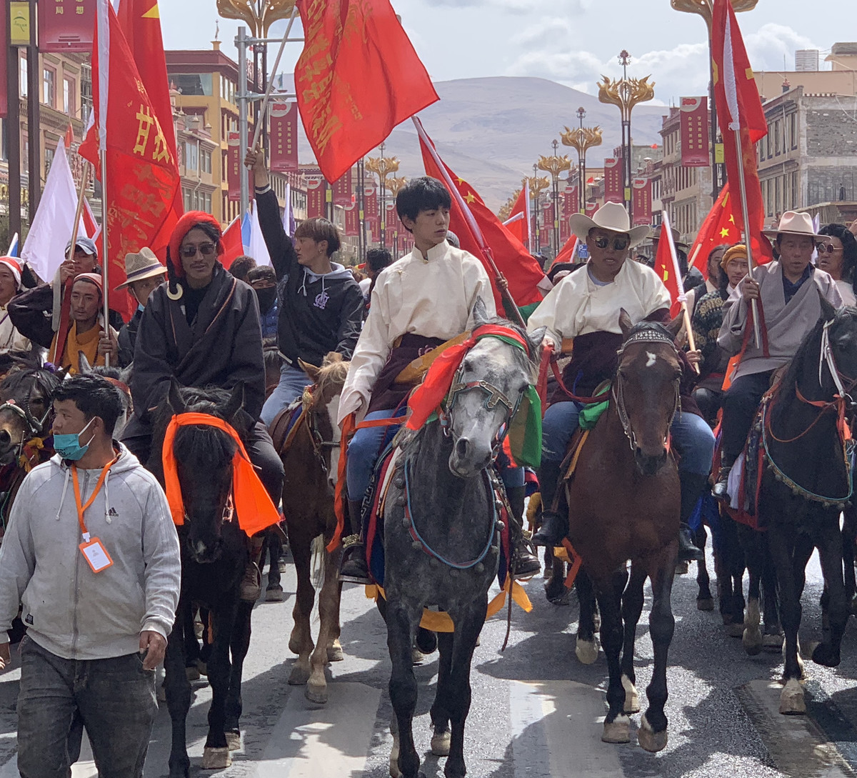 5月1日上午,2021理塘国际赛马节系列活动之一 ━马术巡游活动正式启动,来自甘孜州各地知名的90余匹骏马身着盛装,走上街头开展巡游活动。理塘旅游形象大使丁真也参与到巡游活动中,身着华丽礼服的骑手们,骑着装扮一新的马匹相继巡游街头。
