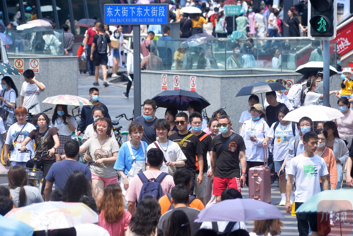 5月1日劳动节,大假第一天的成都艳阳高照,中午时分的成都市区气温一度飙升至36°C,市中心的春熙路、蜀都干道、东大街照样人潮汹涌,停车场更是车满为患。作为假期目的地的城市,乘火车抵达成都的各地游客蜂拥而至,节日大假的成都迎来了四海宾客。