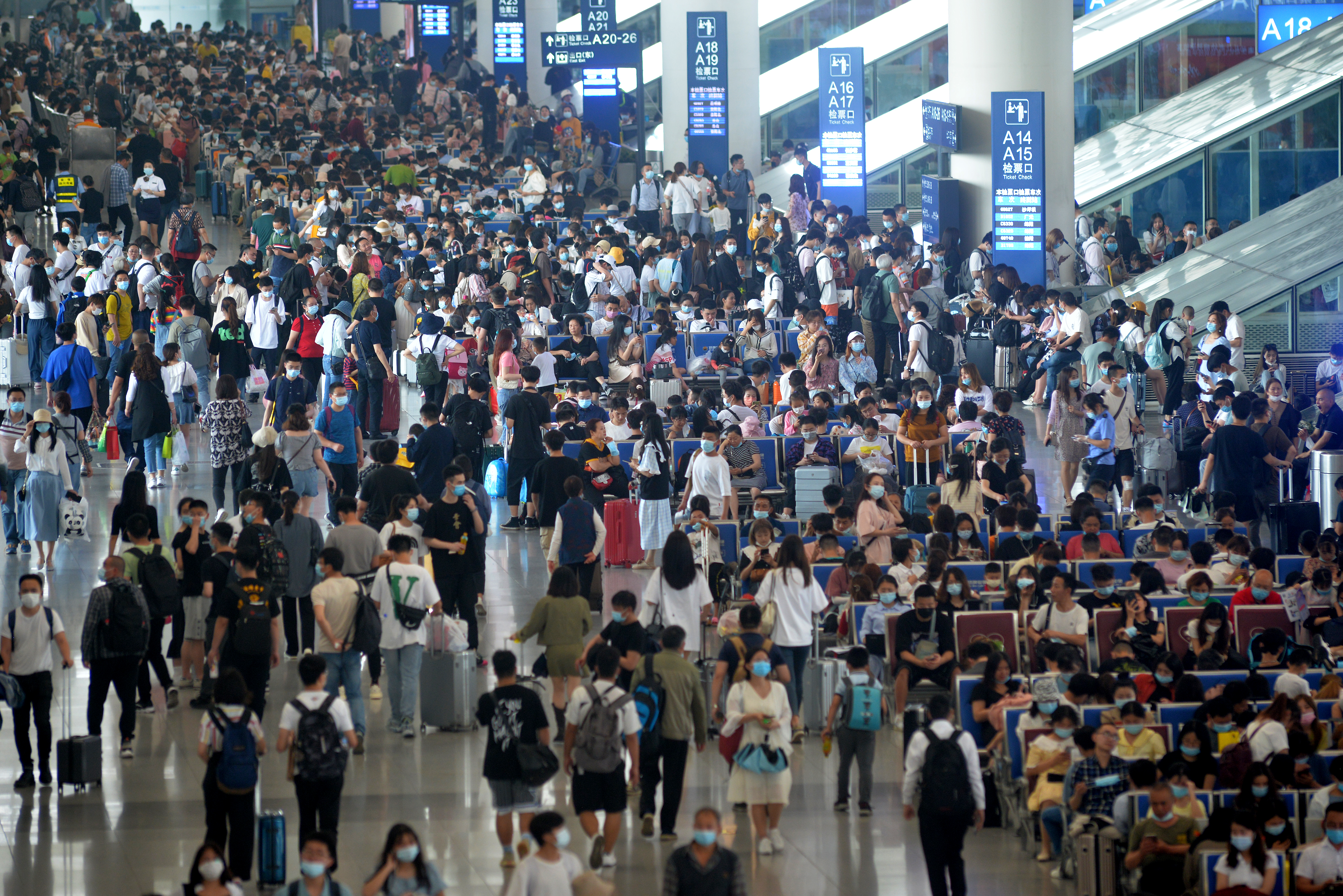 成都东客站候车大厅内的旅客在排队