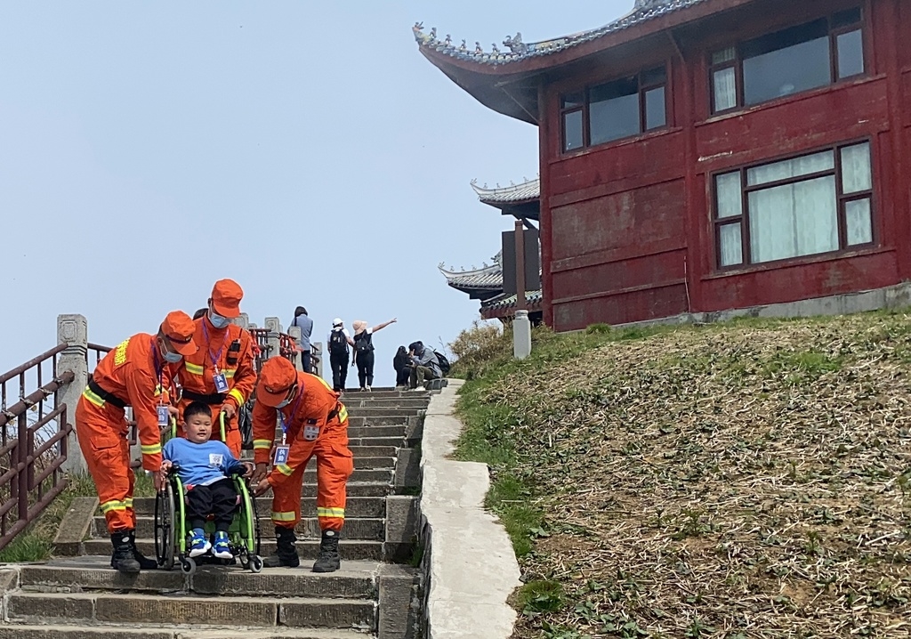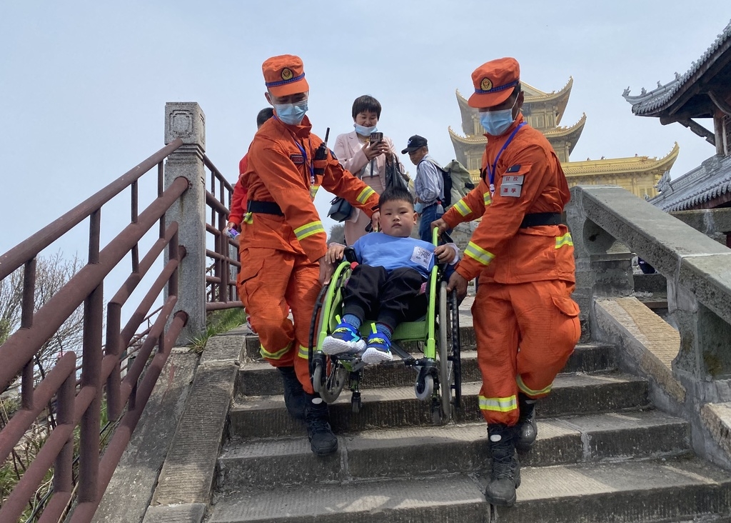 “五一”佳节,全国各地旅游景点都迎来了人流量高峰期,峨眉山作为知名佛山之一也不例外。假期首日,甘孜州森林消防支队峨眉山市驻防分队作为防灭火尖刀力量,也提前到达各执勤点位开展勤务工作。当消防员晏佳鑫正带着队员在金顶片区开展勤务工作时,见有游客往下山方向抬着轮椅游览,立马上前询问情况给予帮助,并联系景区管委会采取“爱心接力”的形式,将这对夫妇和有残疾的少年安全护送下山。