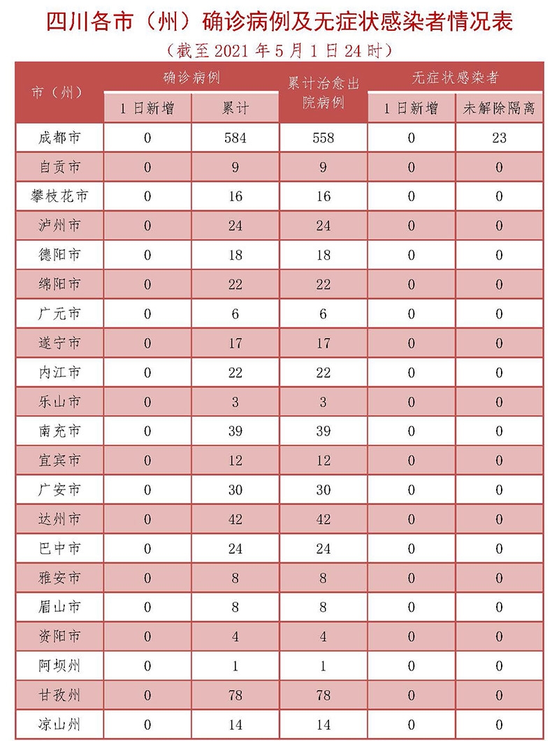 5月2日记者从省卫健委获悉,5月1日0-24时,四川无新增新型冠状病毒肺炎确诊病例,无新增治愈出院病例,无新增疑似病例,无新增死亡病例。