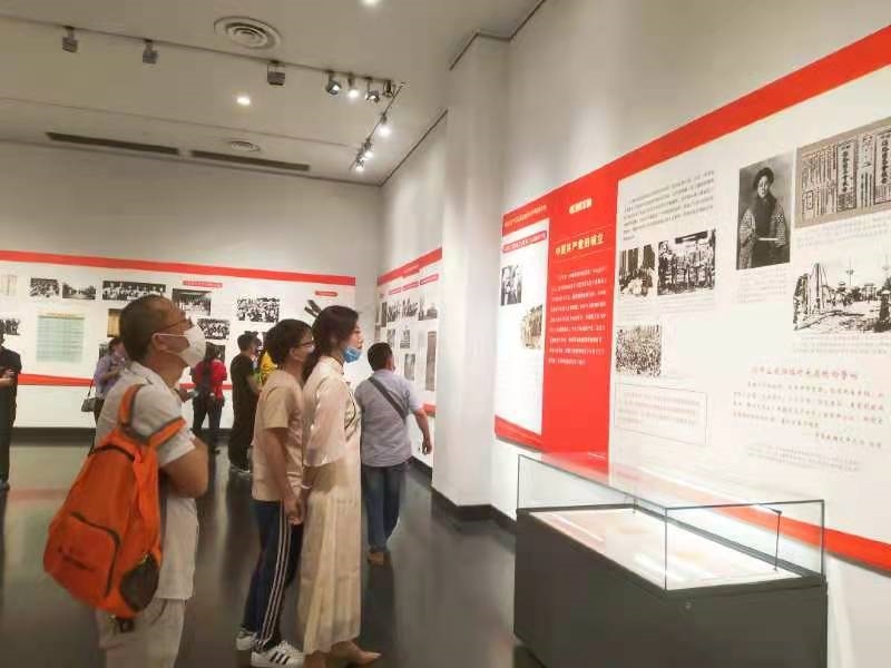 展馆内,整个展览以红、白色为主基调,各个版块以图片、文字和多媒体形式展示着中国共产党成立这一历史事件的不同历史阶段。各个年龄段的游客或驻足细细观看,或拍照留念。