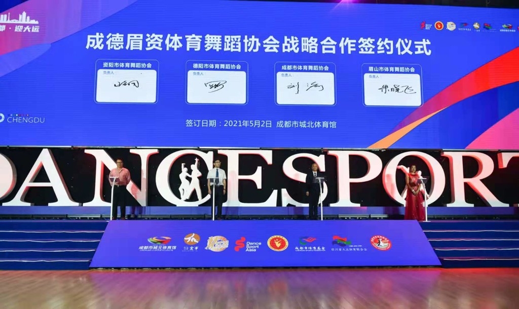 5月2日,成都、德阳、眉山、资阳四地体育舞蹈协会会长签订战略合作协议,未来四地体育舞蹈协会将在赛事(活动)、培训、技术认定等方面进行深度合作,实现四城体育舞蹈的共谋发展。这也是四地体育部门深入贯彻省委“一干多支”发展战略,落实成德眉资同城化发展,加快体育同城化进程的一项有力举措。2020年9月,成都市体育局、德阳市体育局、眉山市教体局、资阳市教体局共同制定了《关于加快推进成德眉资体育同城化发展工作方案》,并举行了气排球、羽毛球、乒乓球等多项城市对抗赛。体育舞蹈作为四地普及度最广的一项运动,自然不甘人后。