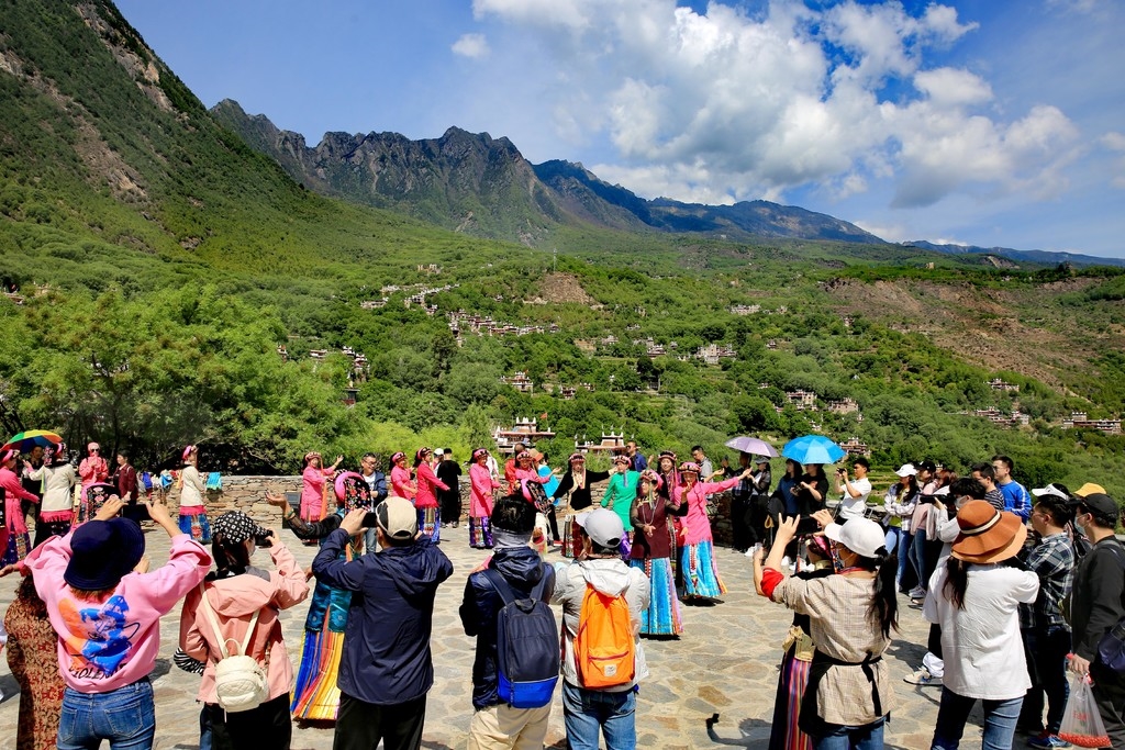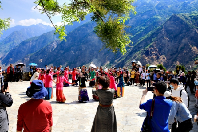 5月2日上午11时,在丹巴县甲居藏寨一号观景台,当地群众用欢快的步伐,曼妙的舞姿,用情呈现独具特色的丹巴文化盛宴。在中路观景台,群众自发组织跳起了传统的锅庄,游客也融入其中,一同欢快起舞。