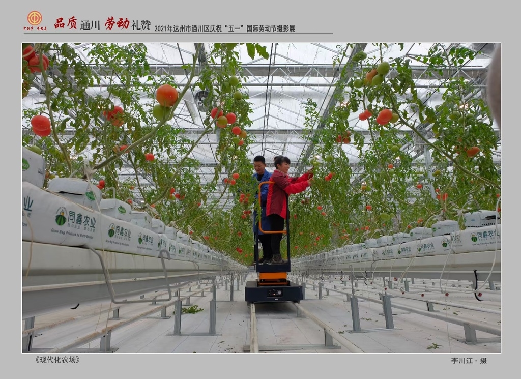一张照片展示了在某现代化农场中两名劳动者采摘番茄的场景。农场中先进的现代化设备、枝条上悬挂着丰硕的果实,让市民郝培德感慨颇深,“从脱贫攻坚到乡村振兴,通川大踏步前进。农业的发展有科技助力,乡村一定会发展的越来越好。”