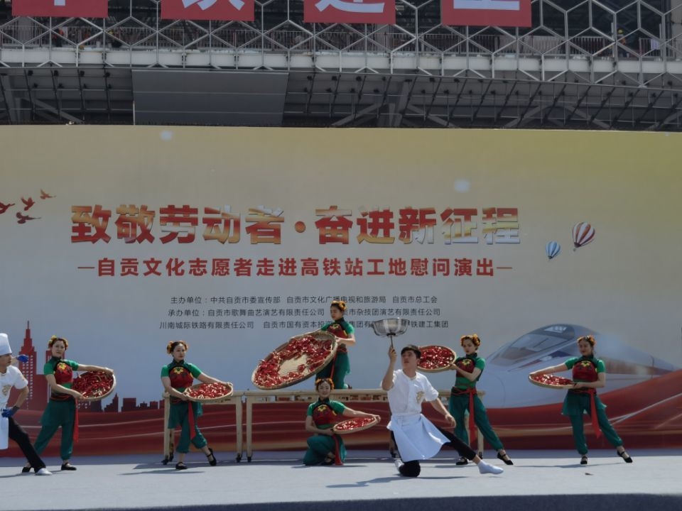 在工地上举办的这场慰问演出,节目精彩纷呈、场面热烈。节目《盐都壮美图》以千百年来盐都人民勤劳智慧为底色,以自贡在抗战期间驰名全国的“献金运动”为高潮,吟唱壮美独特的乡音乡情和历代盐都人的精气神;杂技《盐都美食》以“杂技+”的形式展示自贡的美食文化;舞蹈《我的新衣》将现代流行元素融入传统戏曲舞蹈,展示自贡人包容、创新的精神风貌。