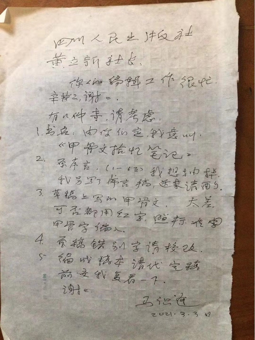 此次能有幸责编马老的图书,缘于四川人民出版社社长黄立新2021年1月22日对马老的一次登门拜访,促成了我社即将出版马老的甲骨文著作《马识途西南联大甲骨文笔记》这件大事。