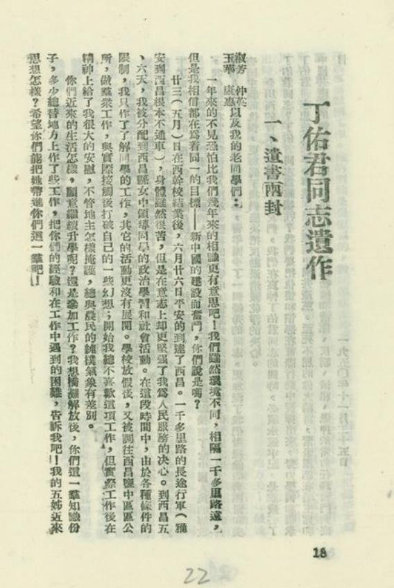 从成都奔赴雅安,长途行军的艰辛并没有让丁佑君退缩。从她写给同学的信中足见她的革命乐观主义精神——“身体虽然很苦,但是在意志上更坚强了我为人民服务的决心”“我可以骄傲的告诉你们一句,在这情形下,我的革命决心,决没有动摇一点,革命本来就苦嘛” ……在校期间,丁佑君如饥似渴地学习。1950年4月,她还被批准为青年团员;第一学期结束时被选为学习模范。