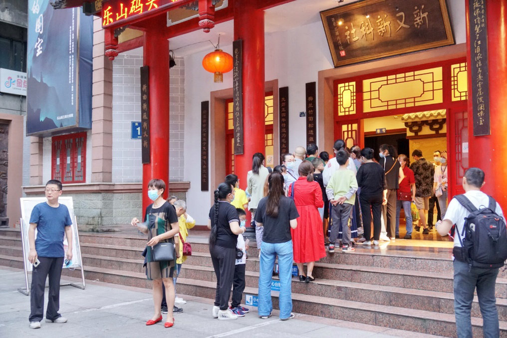 5月4日,夜色下的乐山网红街区东大街人来人往,热闹非凡;省级非遗“嘉阳河”川剧传习展示基地新又新大戏院门口也人潮攒动,晚上六点左右来自本地和各地的游客陆续来到戏院有序排队检票入场,观看当晚19:30由乐山川剧艺术研究院倾情演出的现代川剧《神秘的国宝》。这也是该剧几经改版后的常态化演出的首演。