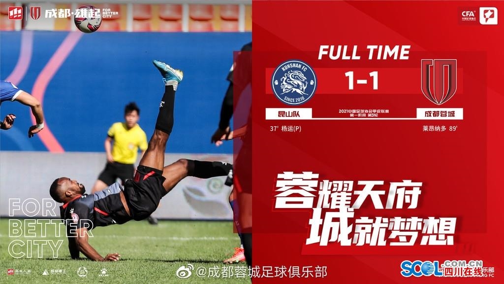 成都蓉城的连胜势头被终止。5月5日,2021赛季中国足球甲级联赛第3轮比赛全面开展。成都蓉城在大连/成都赛区迎来了本赛季的第三个对手昆山队——这也是成都蓉城本赛季遭遇的第一支实力旗鼓相当的队伍。结果90分钟战罢,成都蓉城凭借外援莱昂纳多在最后时刻的倒挂金钩,1:1逼平对手,遗憾无缘三连胜。