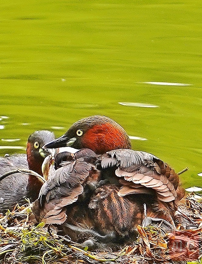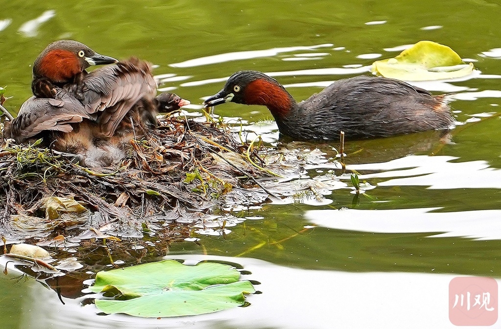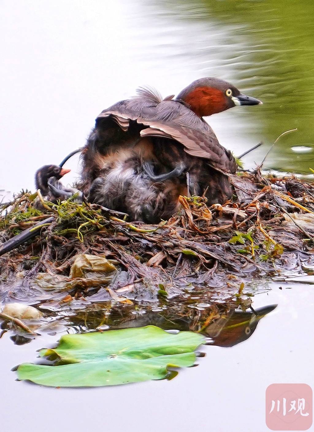 这种生物名为䴙䴘(piti),在都市河湖中最为常见的是赤颈鸊鷉,还有一种凤头䴙䴘属国家二类保护动物。每年的五月是䴙䴘繁殖期,5月5日,四川在线记者在绵竹年画村的莲花池塘旁,用镜头记录了水面上赤颈鸊鷉的孵育生活。