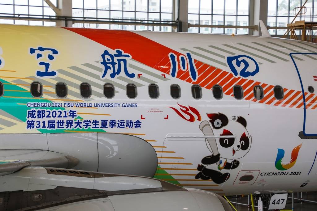 5月7日,川航为成都2021年第31届世界大学生夏季运动会量身打造的“大运号”主题彩绘飞机正式亮相。川航同时透露,该架飞机计划于5月8日投入航班运营,将首先执飞成都往返西双版纳、西安等地的航班。