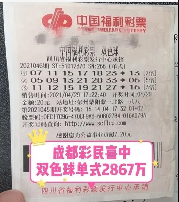4月29日晚,双色球第2021046期开出号码05.09.13.21.28.33+06,全国中奖24注,其中四川彩民一人独揽5注一等奖!巨奖奖金合计2867万元。据检索,这张双色球一等奖彩票诞生在51012370号站,站点位置为彭州市蒙阳镇蒙三北路188号,是单式倍投票,投注金额仅为20元!