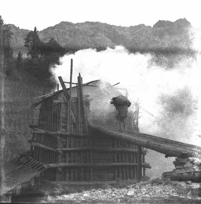 1939年,孙明经拍摄荥经人成铁厂“围木成炉”用传统的方法炼铁。照片中一位工人正将熟矿石背上炉口。