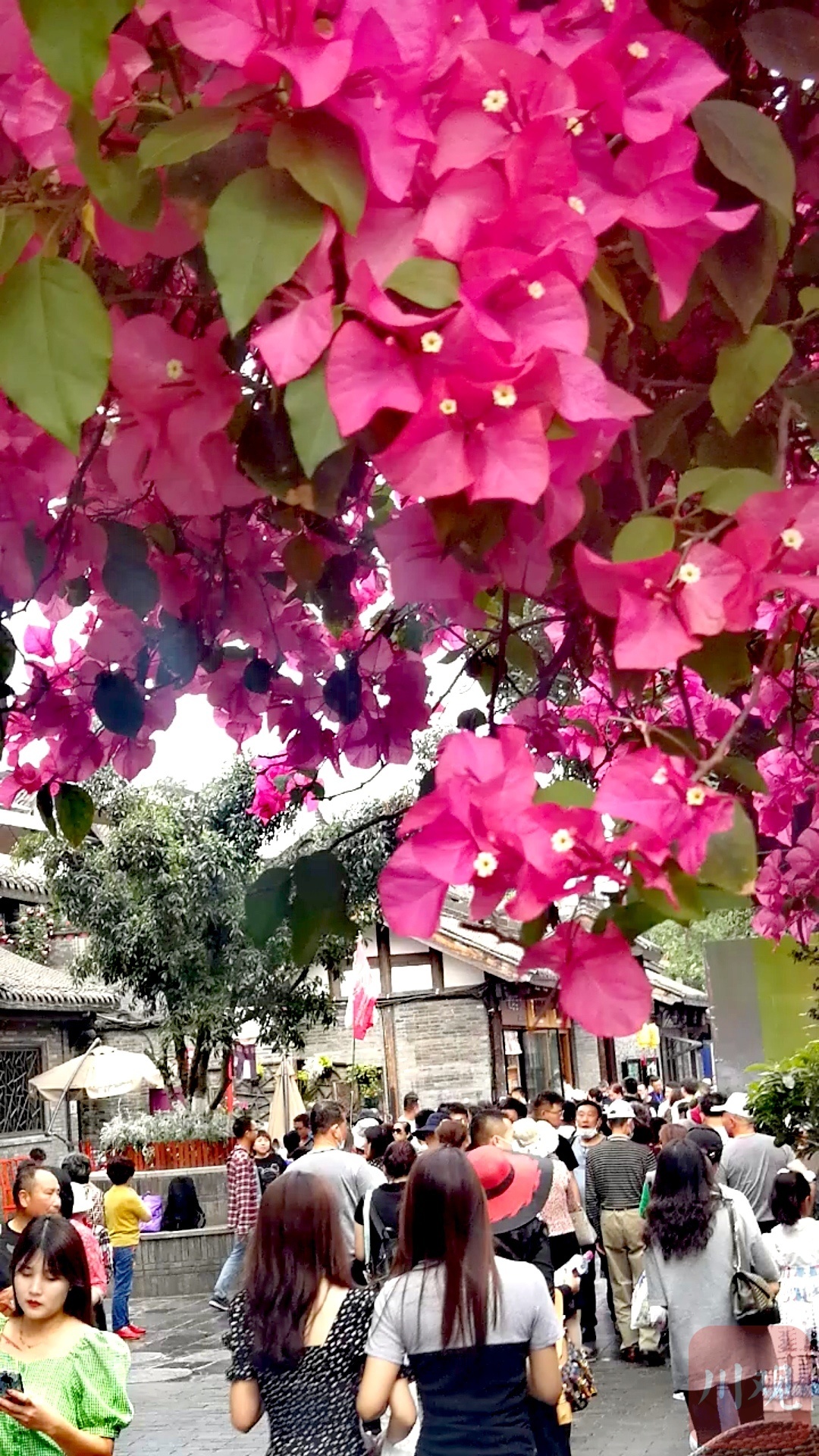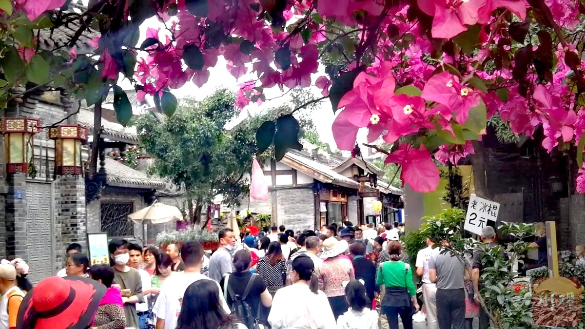 游客们被宽窄巷子的三角梅包围。