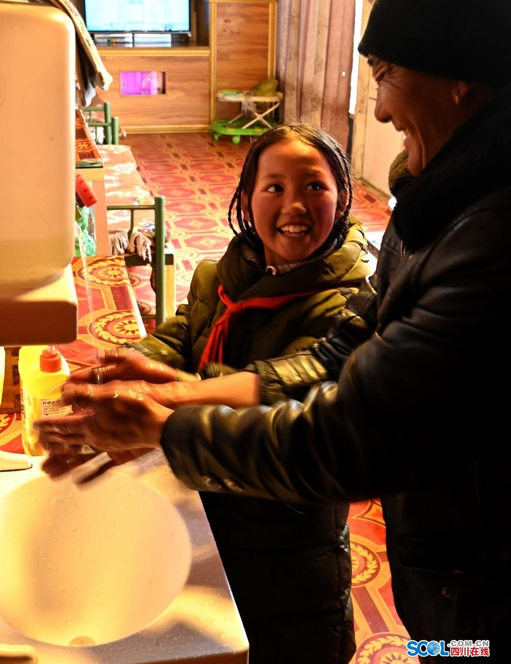 在德荣玛乡草原二村,德荣玛乡中心小学校三年级一班的青绕泽措串门到村民所曲家,和他一起洗手。华小峰摄。