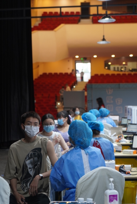 5月10日正式开始接种。早上 8:30,前来接种新冠疫苗的学生在艺术大楼大剧场前有序排起了队伍。同学们佩戴口罩,携带身份证,在志愿者引导下,按照接种流程完成每一步操作:在“预检区”进行预检,如实告知健康状况;到“登记区”进行个人信息登记,提交《新型冠状疫苗知情同意书》给医务人员,随后到“接种区”进行疫苗接种。有序完成接种后的人员,需在场馆内的留观区就座休息,留观半小时后无任何不适方可离开。