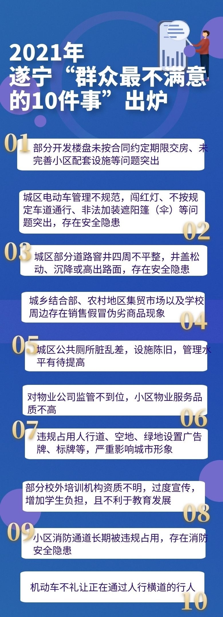 为困难群众和特殊群体免费提供法律援助咨询服务和案件服务、妇女“两癌”救助、机动车礼让行人……5月11日,四川在线记者从遂宁2021年全市30件民生实事暨整治“群众最不满意的10件事”活动新闻发布会上获悉,通过前期广泛征集意见、反复论证研究,遂宁“群众最不满意的10件事”整治事项和2021年全市30件民生实事名单出炉,内容涉及教育卫生、公共服务、基础设施等多个方面。
