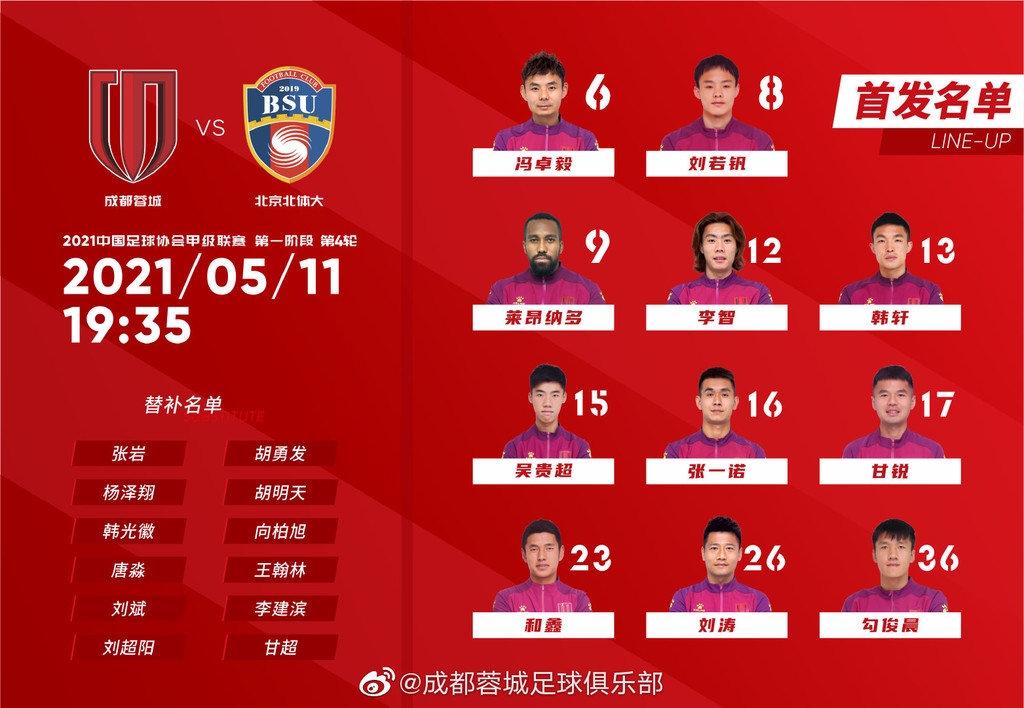 5月11日,2021赛季中国足球甲级联赛第四轮比赛继续进行。在大连/成都赛区出战的成都蓉城凭借刘若钒、莱昂纳多等人的进球,4:1击败北京北体大,继续保持着自己强势冲超的势头。