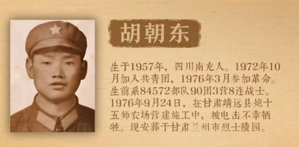 45年前,胡朝东是中国人民解放军84572部队90团3营8连的一名战士。1976年9月24日,在甘肃省靖远县炮十五师农场营建施工中,胡朝东被电击不幸牺牲。现安葬于甘肃省兰州市烈士陵园。但这45年间,胡朝东的亲人一直没能去他墓前祭扫。