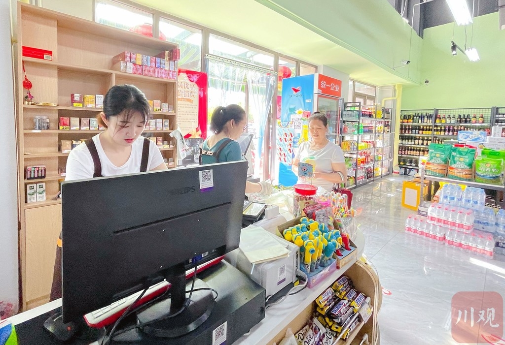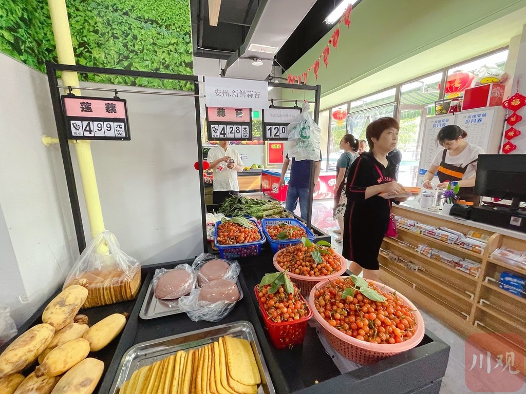 琳琅满目的超市内,小枧镇的莲花白0.88元/斤,新桥镇的茄子2.68元/斤,安州的新鲜蒜台卖4.28元/斤,平武高山白樱桃12元/斤……记者粗略统计了一下,蔬菜、粮油、水果等上百种生活用品80%以上都是本地产。