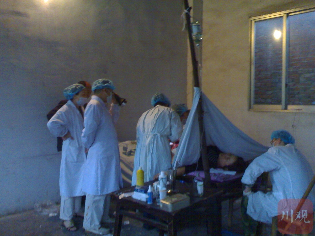 冒着余震的危险,医务人员从已成危房的妇幼保健院库房中,抢出一批医疗、手术器械。没有无菌环境,医务人员认真打扫禅房,喷洒福尔马林消毒;没有手术台,两张禅凳拼起来,再来一张放置手术器械;一根粗糙的木杆成为临时输液架;没有无影灯,一位医生举着手电筒提供照明……第一例手术就以这样的方式进行。