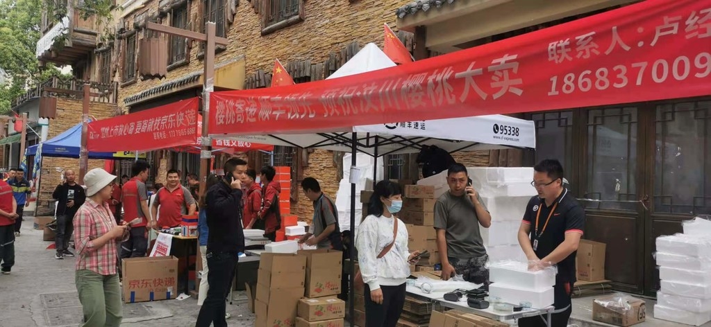 在汶川县城特设的甜樱桃快递寄运区域,到处都能看见邮政、顺风、京东、德邦等各大快递运营商的快递小哥们忙碌的身影,分拣、装箱、贴单,所有动作一气呵成。“今年我们共有20辆冷运车运输汶川甜樱桃,下一步还将投入500多人全力保障汶川甜樱桃的运营。”顺风快递汶川营业部负责人邓李飞说。